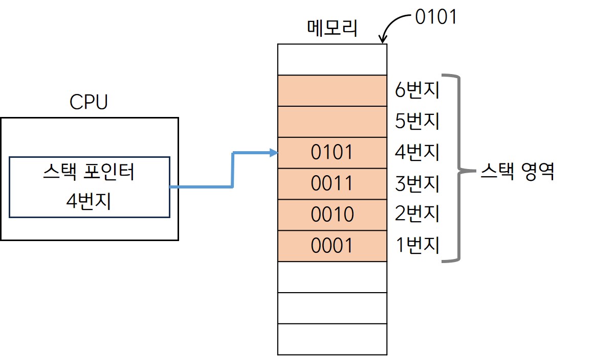 스택에 하나의 데이터를 추가했을 때, 꼭대기 주소가 달라졌으므로 스택 포인터에 '4번지'를 저장한다. |
