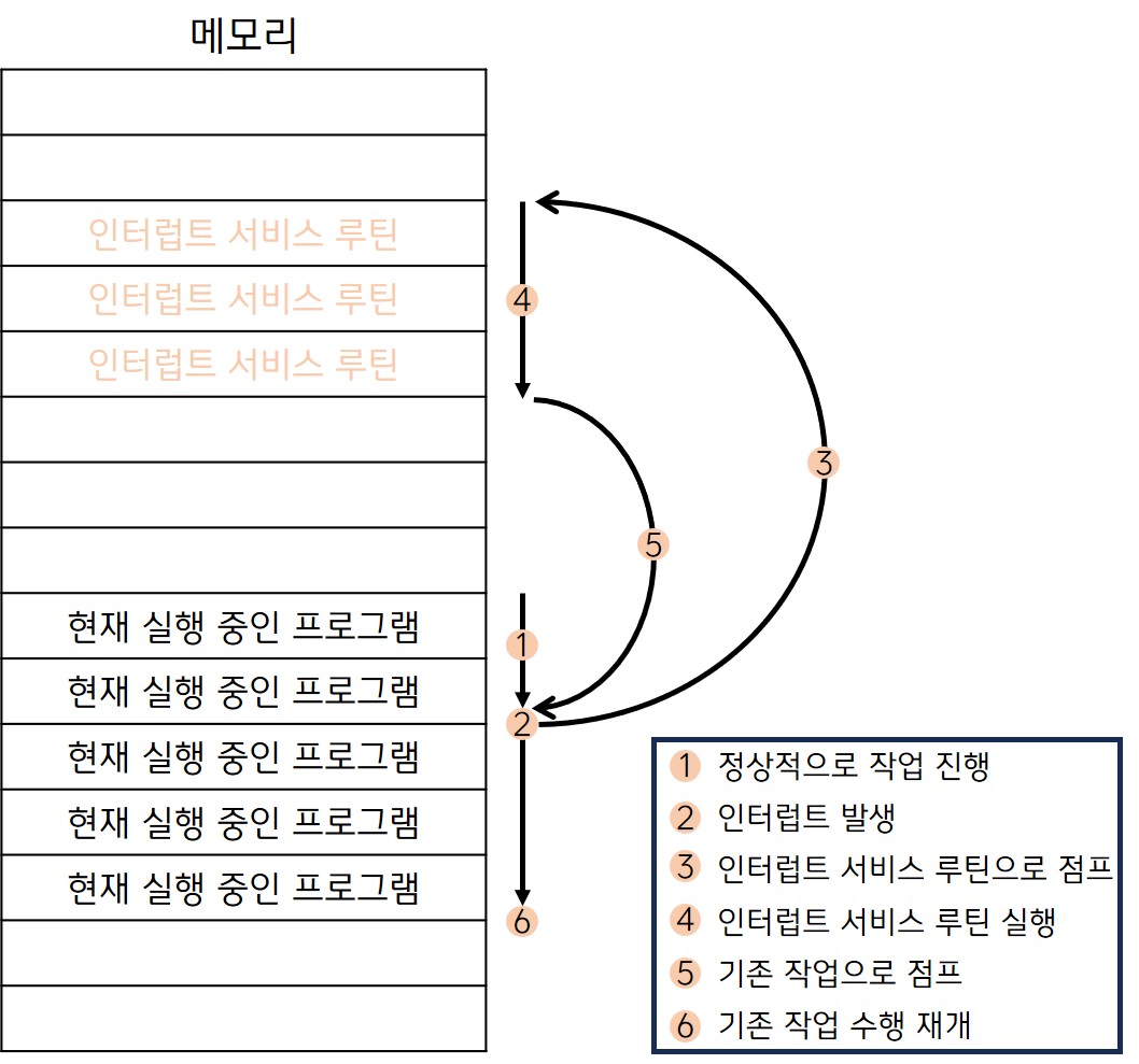 5 | CPU는 인터럽트 벡터를 참조하여 인터럽트 서비스 루틴의 시작 주소가 위치한 곳으로 프로그램 카운터 값을 갱신하고 인터럽트 서비스 루틴을 실행한다. |