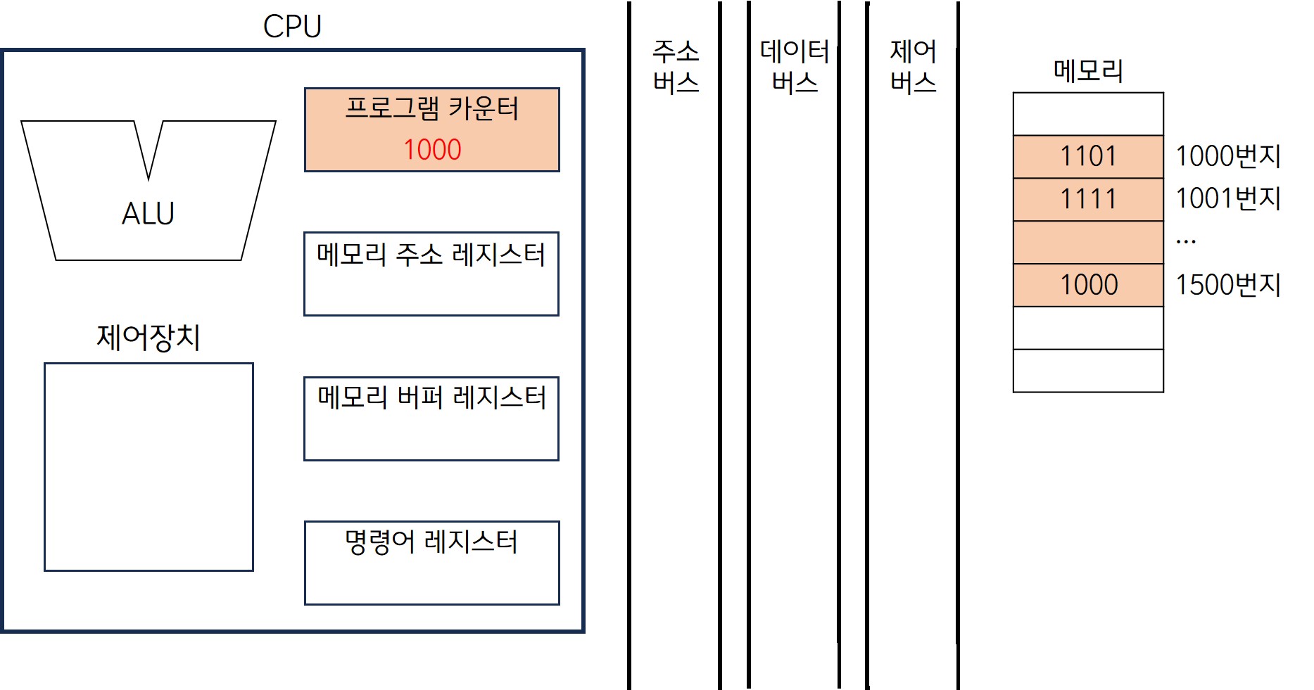 02. 프로그램을 실행하기 위해 프로그램 카운터에 1000이 저장된다. (=메모리에서 가져올 명령어가 1000번지에 있다.) |