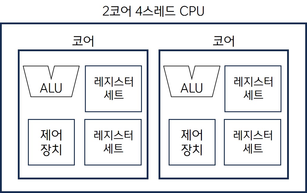 ex) 2코어 4스레드 CPU : 명령어를 실행하는 부품(코어)을 2개 포함하고, 한 번에 4개의 명령어를 처리할 수 있는 CPU